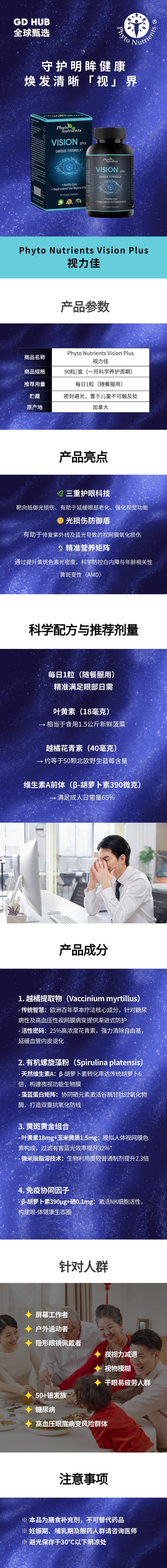 Phyto Nutrients视力佳有助于维持和改善因阳光损伤、白内障以及年龄相关性黄斑变性所影响的视力。它是一种抗氧化剂来源,有助于维持身体健康。该产品有助于提高黄斑色素光密度,对视力和免疫功能有辅助作用。在草药医学中,越橘常用于帮助减缓眼部疾病的发展进程,比如糖尿病性视网膜病变和高血压性视网膜病变。螺旋藻是β-胡萝卜素的来源,β-胡萝卜素是一种维生素A原,有助于夜视能力的发育和维持。